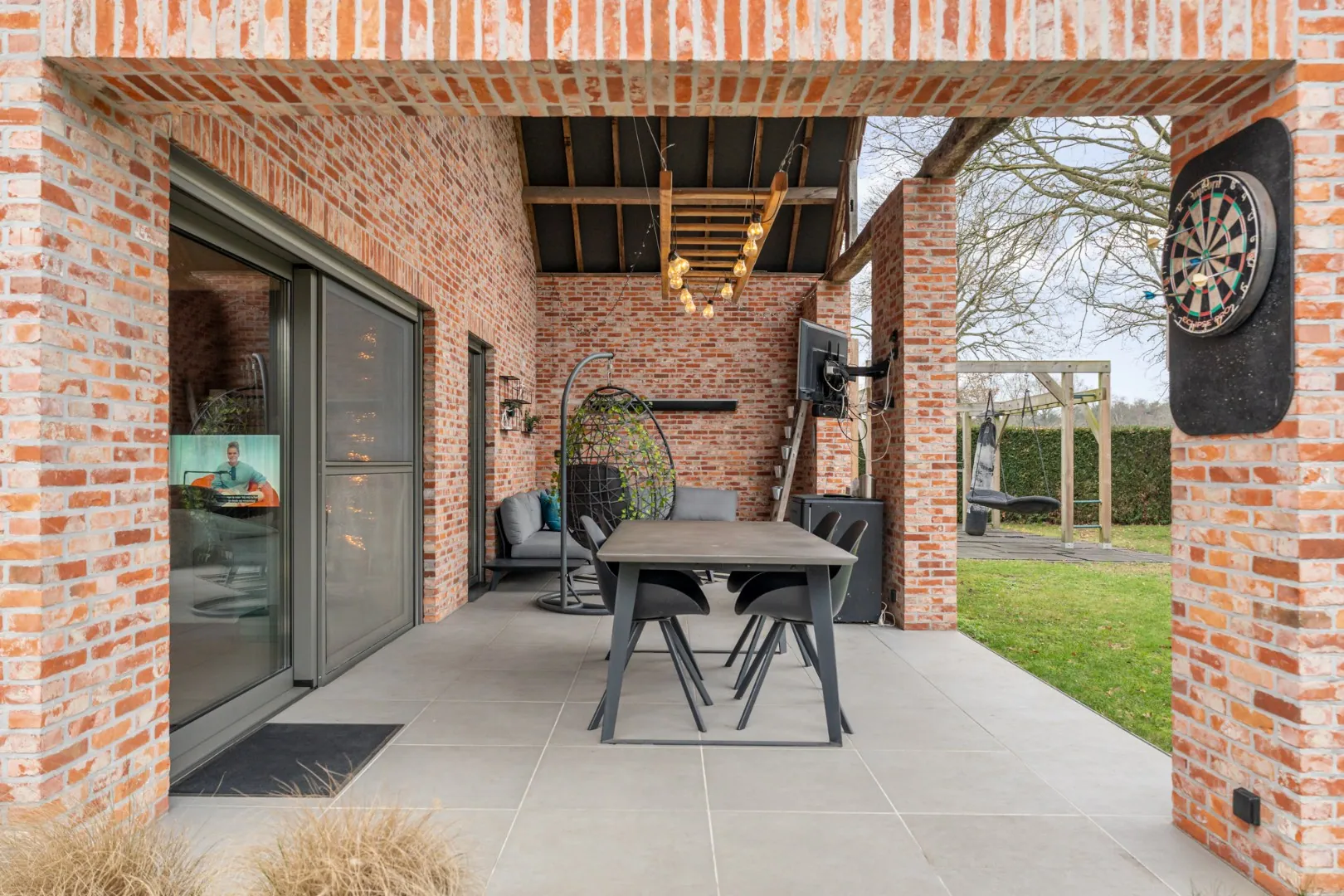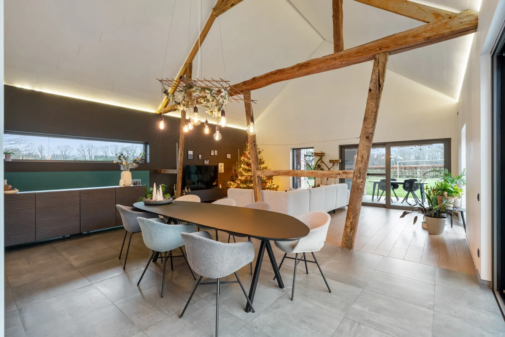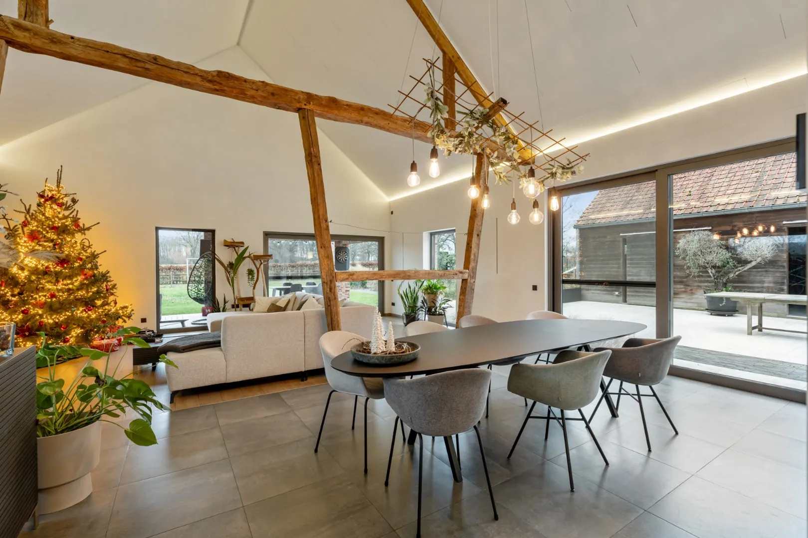 Royale zit- en eetkamer met open keuken en zicht op de tuin en het terras.