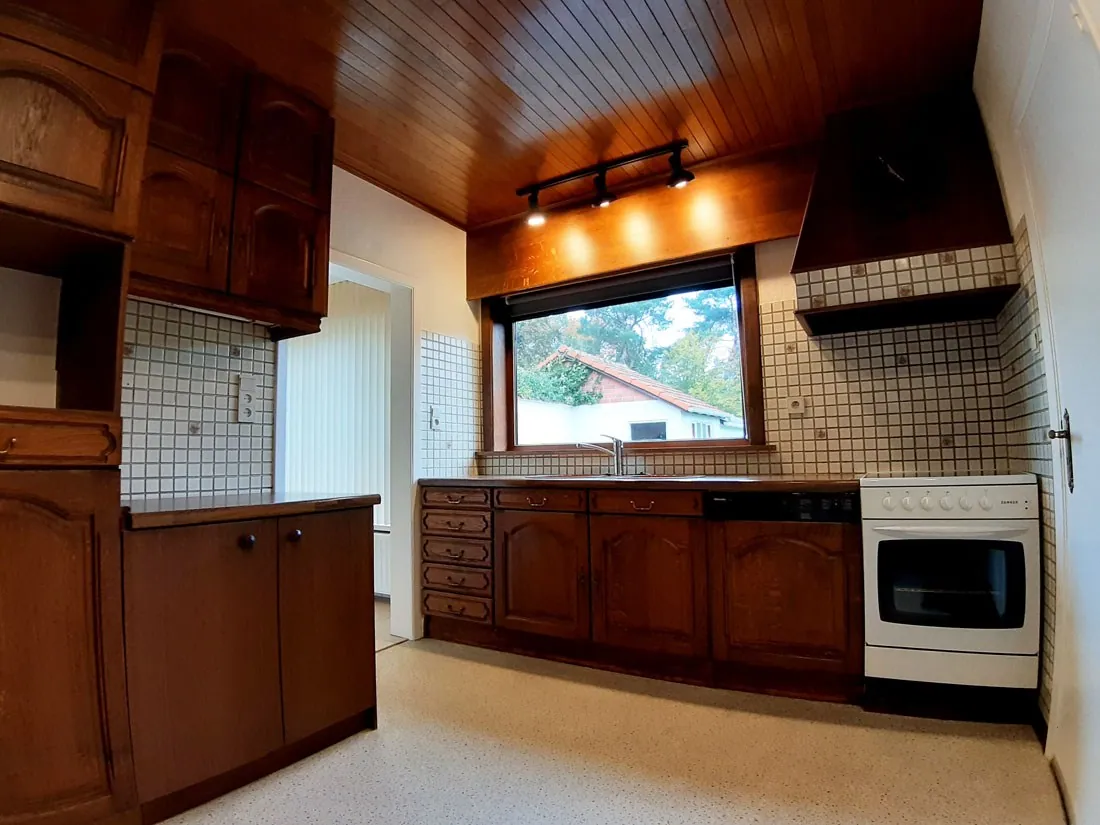 Dit pand heeft o.a. drie slaapkamers, een ingerichte keuken en badkamer, berging en een bureel. De inpandige garage is ruim en kan zowel een wagen stallen als deels gebruikt worden als berging.